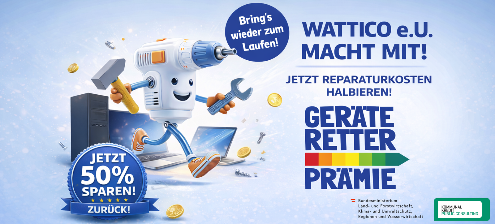 Geräte-Retter-Bon einlösen und Rechnungsbetrag bezahlen. Die Fördereinreichung erfolgt durch den Partnerbetrieb.